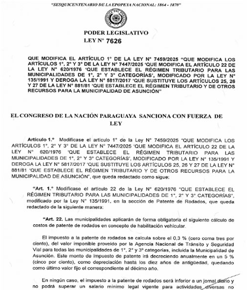 Ley N° 7626/2025 Que modifica los artículos 1° de la Ley Nº 7459/2025 “Que modifica los artículos 1°, 2° y 3° de la Ley N° 7447/2025 «Que modifica el artículo 22 de la Ley N° 620/1976 «Que establece el Régimen Tributario para las Municipalidades de 1°, 2° y 3° Categorías», Modificado por la Ley N° 135/1991 y Deroga la Ley N° 5817/2017 «Que Sustituye los artículos 25, 26 y 27 de la Ley N° 881/81 ‘Que establece el Régimen Tributario y de otros Recursos para la Municipalidad de Asunción’»”.