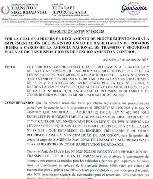 Resolución ANTSV N° 582/2025 Por la cual se aprueba el Reglamento de Procedimientos para la Implementación del Registro Único de Habilitación de Rodados (RUHR) a cargo de la Agencia Nacional de Tránsito y Seguridad Vial y se dictan disposiciones de funcionamiento y Control.