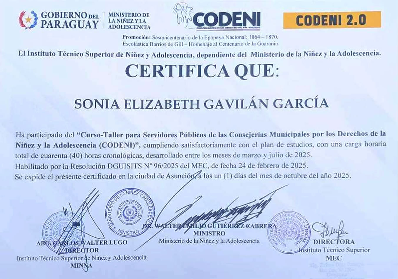 El Curso Taller para Servidores Públicos de las Consejerías Municipales por los Derechos de la Niñez y Adolescencia, dictado por el Instituto Técnico Superior de Niñez y Adolescencia, dependiente del Ministerio de la Niñez y la Adolescencia, culminó satisfactoriamente, desarrollando plenamente el plan de estudio, con una carga horaria total de cuarenta horas cronológicas, desarrolladas entre los meses de marzo a julio de 2025. El Curso-Taller está habilitado por la Resolución DGUISITS Nº 96/2025 del MEC, de fecha 24 de febrero de 2025. |