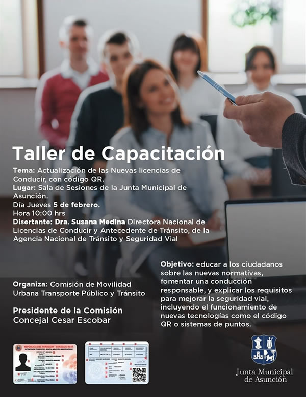 La Comisión de Movilidad Urbana, Transporte Público y Tránsito, presidida por el concejal César Escobar, llevó a cabo una jornada de trabajo y capacitación sobre la nueva implementación y actualización de las licencias de conducir en su nuevo diseño. Esta actualización incorpora el Código de Verificación QR, con el objetivo de educar a la ciudadanía sobre las normas de tránsito, fomentar la conducción responsable y fortalecer los mecanismos de control vial. El evento se realizó en la Sala de Sesiones de la Junta Municipal de Asunción y contó como disertante con la directora nacional de Licencias y Antecedentes de Tránsito, la escribana pública Susana Machado. La capacitación estuvo dirigida a funcionarios de distintas direcciones, efectivos de la Policía Municipal de Tránsito y jueces de faltas. |